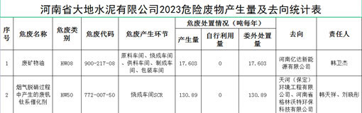 河南省大地水泥有限公司2023危险废物产生量及去向统计表