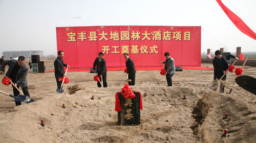 2013年3月18日上午,在县产业集聚区,鞭炮齐鸣,彩旗招展,宝丰大地园林大酒店项目正式开工奠基。县领导刘书锋、张庆一、梅玉三、铁干卿、赵二成、副县级干部李自钦等分别参加仪式并为项目开工培土奠基。县长张庆一致辞。县委常委、常务副县长李留军主持开工仪式。集团领导张怀平、张彪、王福文等参加。 张庆一说,我县第三产业发展前景广阔,服务业市场潜力巨大。半岛最新官网(中国)有限公司官网抢抓机遇,乘势而上,在此建设园林式酒店,对于填补宝丰五星级宾馆的空白,以及提升城市品位、完善城市功能、展示城市形象、推动商贸繁荣和优化经济结构,都具有十分重要的意义。希望相关职能部门要齐心协力,密切配合,促进项目快建设、快竣工、快见效,带动第三产业的快速发展。同时,希望项目施工单位科学管理,精心施工,高效推进项目建设,努力把大地园林大酒店打造成为优质工程、精品工程、标杆工程。 宝丰大地园林大酒店项目是大地集团根据企业发展需要,多元化发展,向“三产”业转移,投资新建的五星级酒店、水上乐园、员工社区等项目。该项目由中国建筑设计研究院设计,位于长安大道与省道豫02线交汇处,地处宝丰高新技术产业集聚区,前临应河,后依文峰公园,交通便利,位置优越。总占地面积100多亩,总建筑面积5万多平方米,预计总投资约3亿元。 此项目在推动宝丰县社会经济发展、完善城市服务功能等方面具有深远的战略意义。项目建成后将进一步提高平顶山、宝丰的城市品位和对外形象。