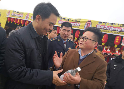 2月26日(农历正月十一)上午,宝丰县委书记张庆一在马街书会检查工作时,来到富平春展台前了解贾湖酒业为马街书会的服务情况(上图为贾湖酒业集团销售公司总经理宋子玉向张书记汇报中原味道系列的酿造工艺)。
